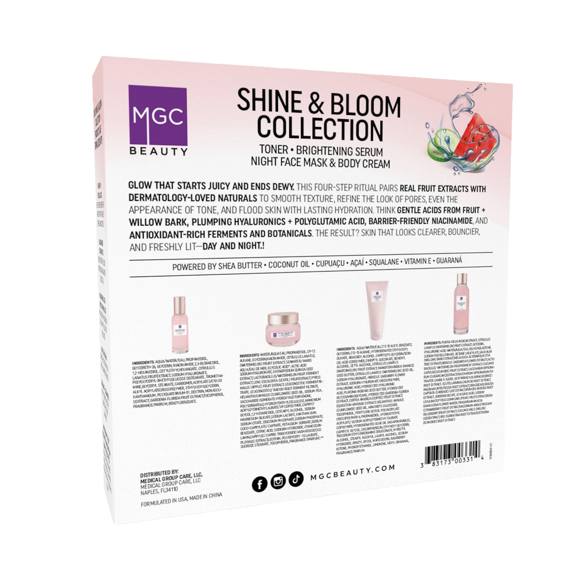 Elevate your skincare routine with the MGC Beauty Shine & Bloom 4-Piece Set — a complete regimen designed to brighten, refine, and deeply hydrate. The set includes: PHA & BHA Dual Acid Pore Tightening Toner, which gently exfoliates and minimizes the appearance of pores for smoother, clearer skin; Brightening Serum with Fruit Extract, a lightweight serum packed with natural fruit extracts to visibly even skin tone and boost radiance; AHA Night Face Mask with Fruit Extract, an overnight treatment that resurfaces and renews skin while you sleep; and Vitamin-Rich Daily Hydrating Body Cream, a luxurious body cream that nourishes and locks in moisture for silky-soft skin all day long. Perfect for all skin types seeking a fresh, luminous glow.